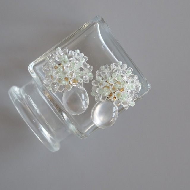 クリアガラスのお花ビーズを使用し、瑞々しさをたっぷり束ねたブーケ ぽってりと滴るしずくがその透明感をさらに際立たせます 淡いグリーンのビーズでほんのひとさじ色味を入れると ピリッと締まった氷のようなブーケに、優しい雰囲気が加わりました 耳たぶから溢れるくらいに ガラスビーズをたっぷり使ったリッチなボリュームです そのふんわりとした丸みを出すために 少し高さを出して小花を台に留め 立体感を重視して1つづつ編み留めました ビーズステッチ用のしなやかなナイロン糸を使用し、柔らかな仕上がりになっています ピアスはポストチタン イヤリングはネジバネ式、蝶バネ式が選択できます 蝶バネ式で制作できない作品に限り、三角バネ式イヤリングでの制作となります サイズ:約3.5×2.5cm 素材:ガラスフラワービーズ ガラスビーズ アクリルビーズ 金属アレルギーには個人差がございます 全ての方がアレルギー反応が出ないことを保証するものではございませんのでご注意ください 繊細な作りのため、お取り扱いの際には無理な力など加えないようお願いいたします メッキは汗や皮脂に触れると変色しやすくなります ご使用の後は乾いた柔らかい布等で拭きお手入れをしてください