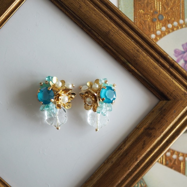 鮮やかなブルーのガラスストーン 可愛らしく咲く小花 束ねて軽やかな花束に仕立てたピアス/イヤリングです 目を引くブルーのストーンは カットによる煌めきというよりは、表面の光沢感と透けて見えるカラーを楽しめます 合わせたのはこちらも鮮やかで爽やかさを感じる天然石、アパタイトとアマゾナイト しっかりと色の存在感を出しながらも クリアな抜け感を加えました ピアスはポストチタン イヤリングはネジバネ式でのお作りです サイズ:約2.5cm 素材:ガラスストーン(8mm) アパタイト アマゾナイト クリアフラワー(アクリル) フラワーパーツ ポストチタン 金属アレルギーには個人差がございます 全ての方がアレルギー反応が出ないことを保証するものではございませんのでご注意ください 繊細な作りのため、お取り扱いの際には無理な力など加えないようお願いいたします メッキは汗や皮脂に触れると変色しやすくなります ご使用の後は乾いた柔らかい布等で拭きお手入れをしてください