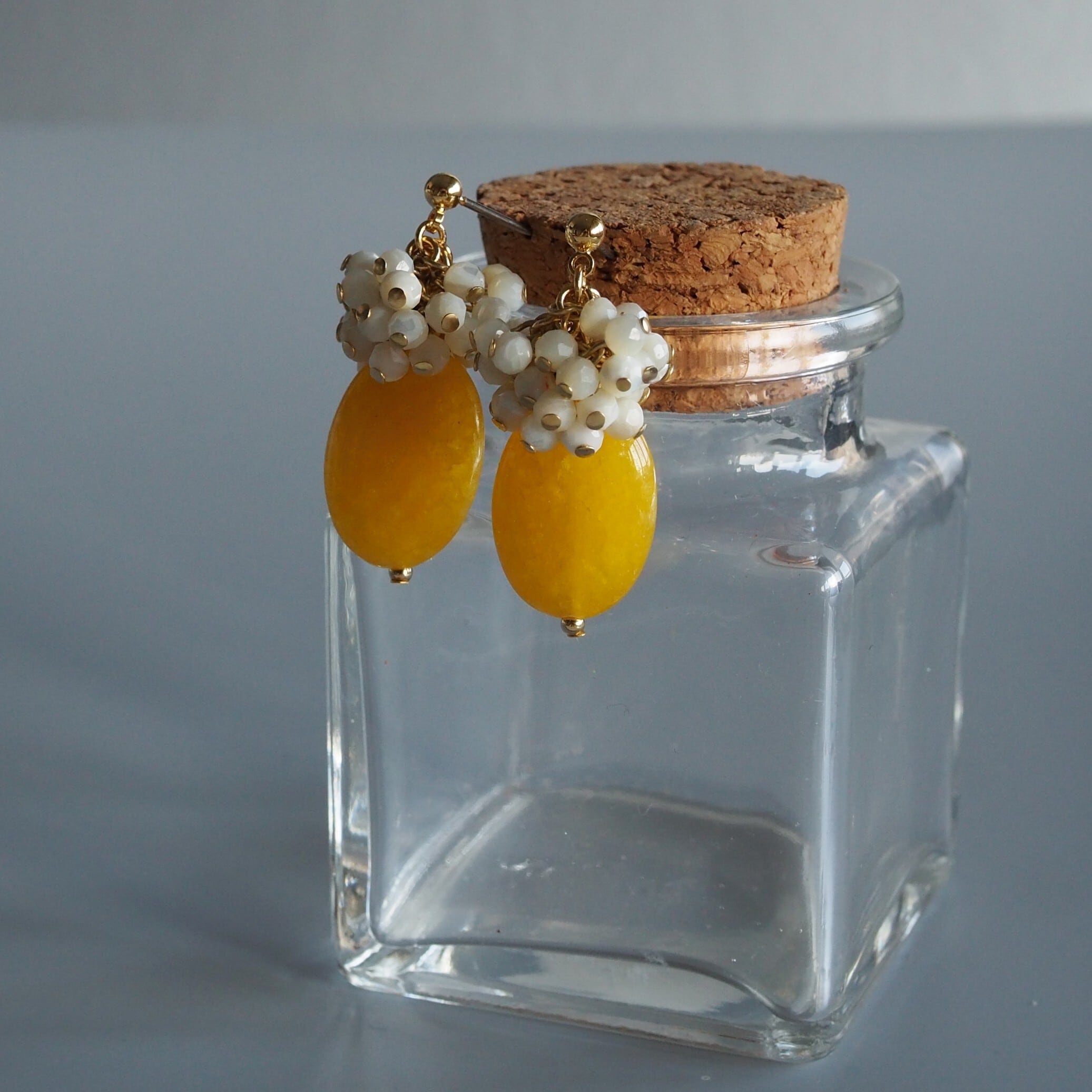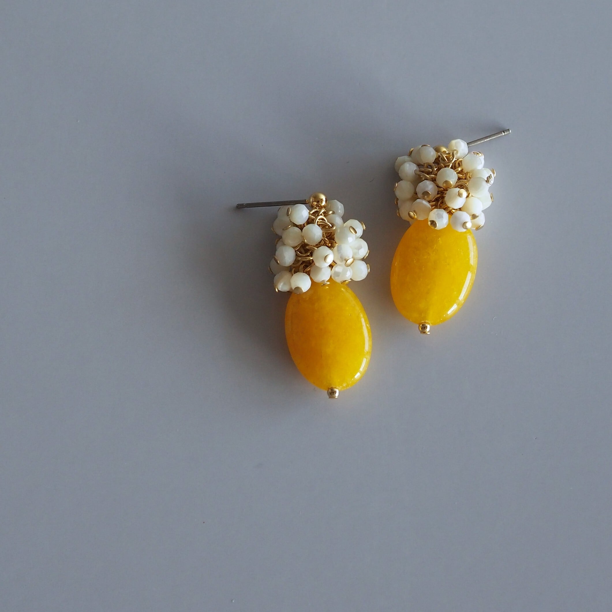 たっぷりのマザーオブパールをあしらいボリューム感満載のピアス/イヤリングに仕上げました