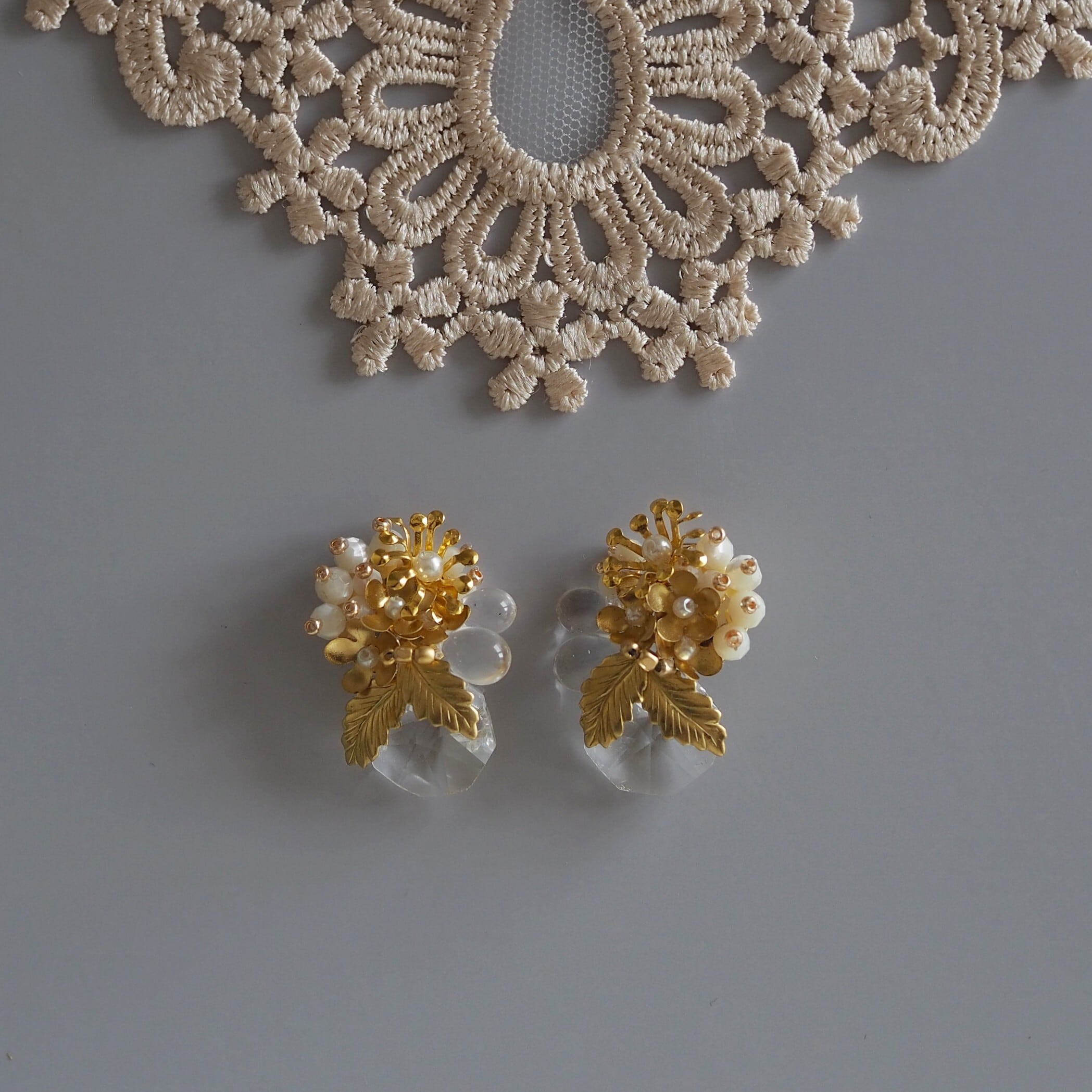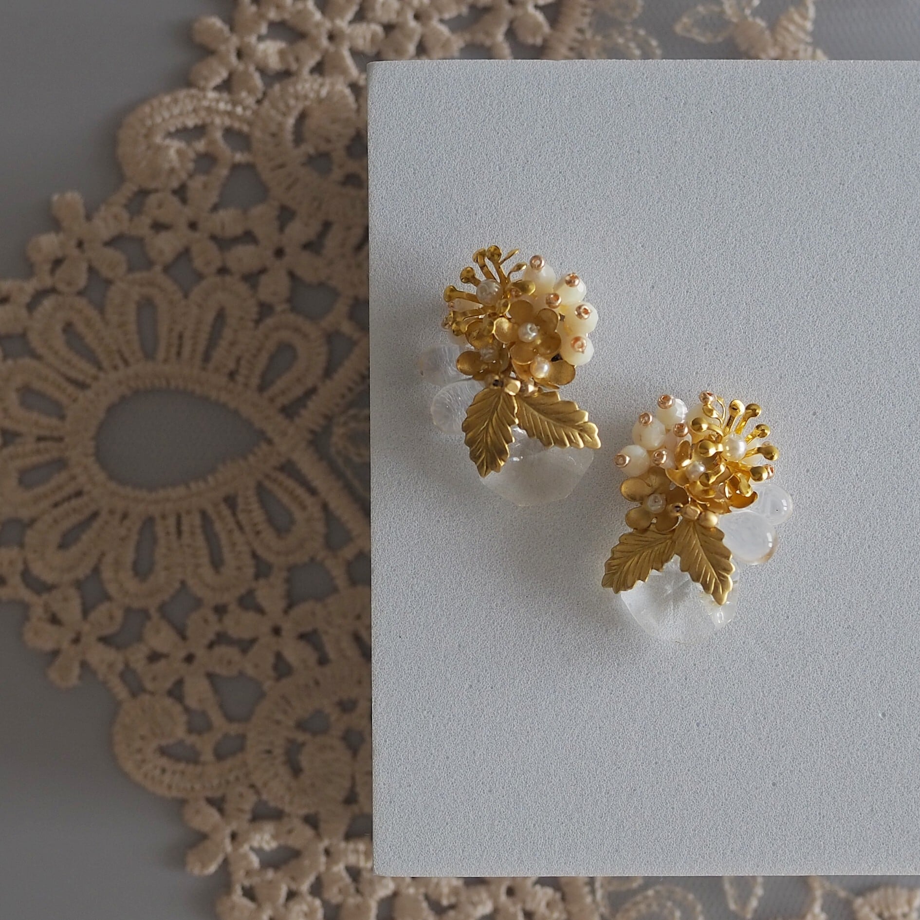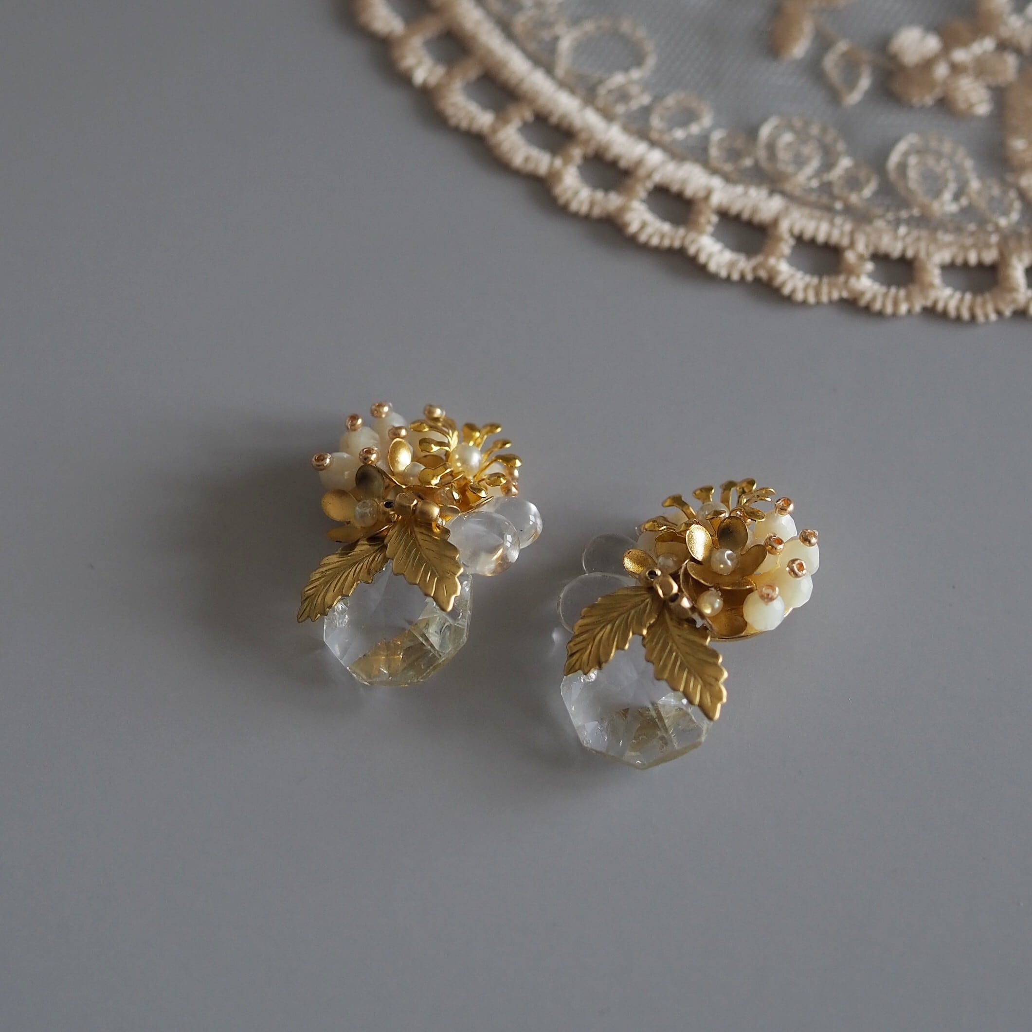 真鍮のフラワーやリーフパーツは落ち着いた質感のゴールド